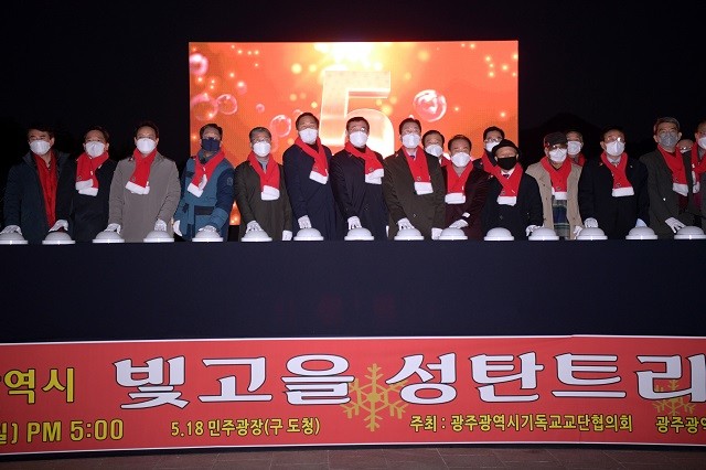 [광주=정찬남 기자] 이용섭 광주광역시장(좌측부터 7번)이 5일 오후 5·18민주광장에서 열린 2021 빛고을 성탄문화축제 성탄트리 점화식에 참석해 축하메세지를 한 후 참석자들과 함께 성탄트리 점화를 하고 있다.