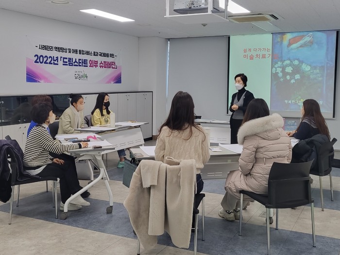 이날 외부 슈퍼비전은‘사례관리를 위한 미술심리 상담기법 적용 및 실천방법’을 주제로 드림스타트 아동통합사례관리사들이 사례관리 실천 현장에서 적용하고 실천할 수 있는 미술심리 상담기법 등 교육과 자문, 지도를 받았다.