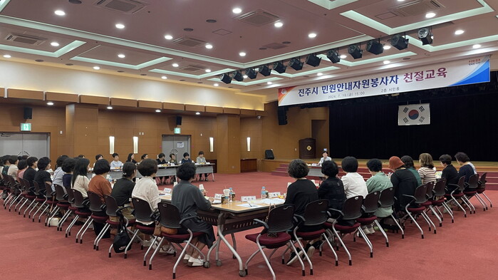 진주시는 19일 시민들에게 양질의 민원서비스를 제공하기 위해 민원안내 자원봉사자 40여 명을 대상으로 민원인 응대 방법 등 친절교육을 실시했다.