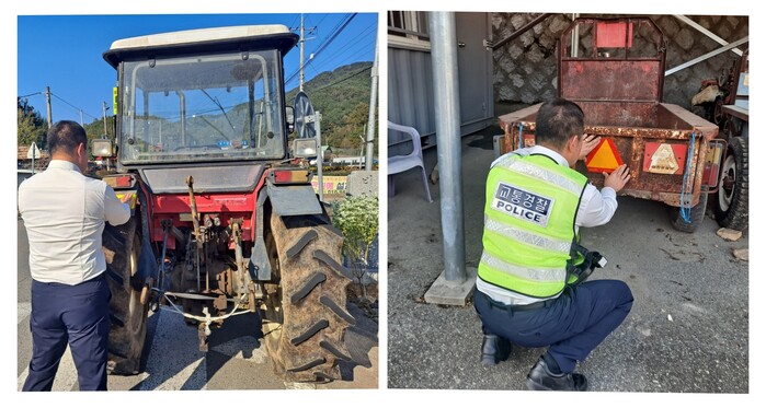[합천=이영수 기자] 합천경찰서에서는 수확철 농업인들의 농기계 교통사고 예방을 위해 트랙터, 경운기 등 농기계에 야광반사지를 부착하고 있다.