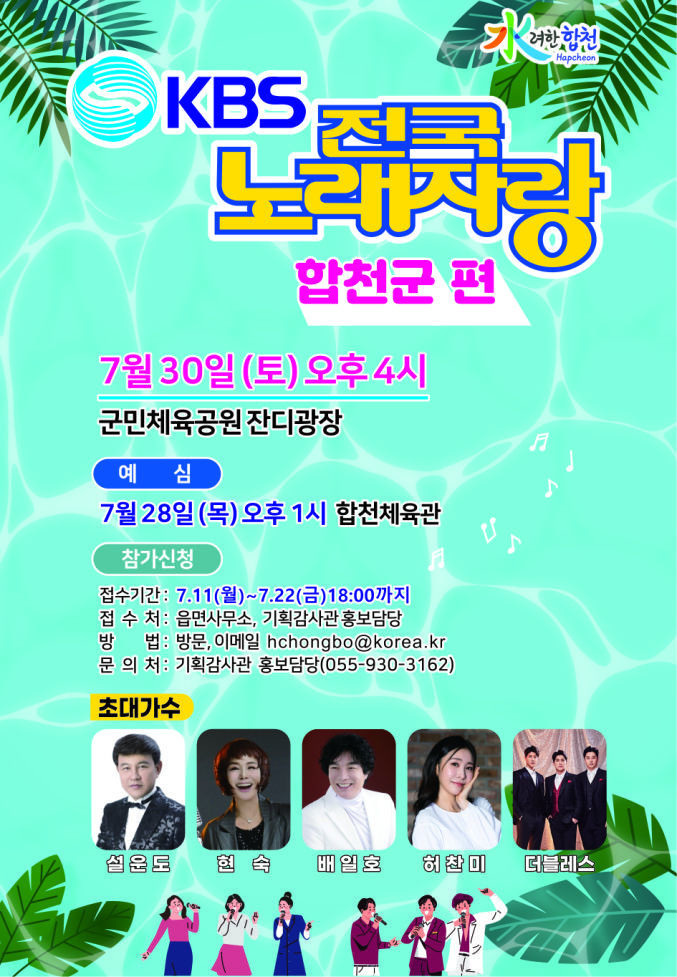 합천군(군수 김윤철)은 오는 30일 오후 4시에 군민체육공원 잔디광장에서 ‘KBS 전국노래자랑 합천군편’을 공개녹화한다고 15일 밝혔다.