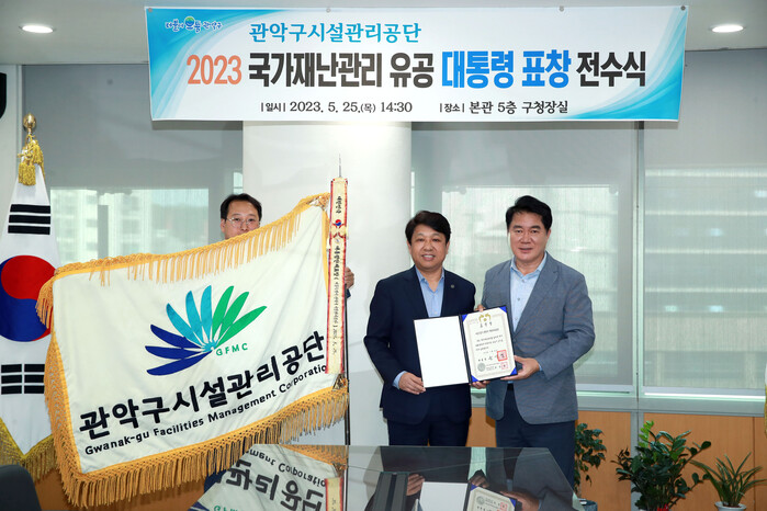 | ▲ 국가재난관리 유공 대통령 표창장 및 수치 전수식 사진.(사진=관악구시설관리공단) |