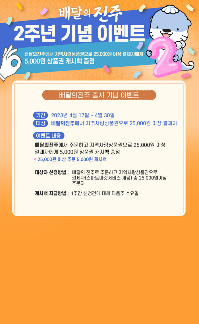 출시 기념 이벤트는 지역사랑상품권으로 2만5000원 이상 주문 결제하면 진주형 배달앱 상품권 5000원을 캐시백으로 지급 받는다.