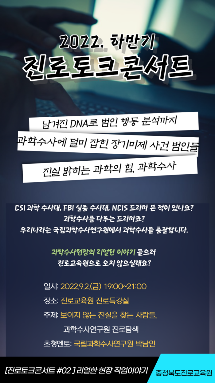 이번 진로토크콘서트는 국립과학수사연구원 박남인 박사를 초청해 ‘보이지 않는 진실을 찾는 사람들, 과학수사연구원’ 이라는 주제로 국립과학수사연구소 소개와 디지털포렌식 수사 방법에 대해 실제 사건을 중심으로 강연이 열렸다.