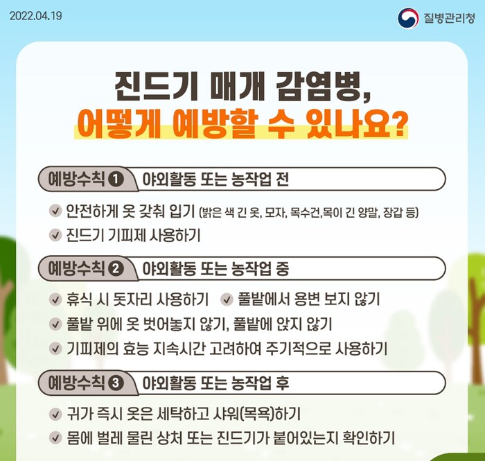 진주시보건소 관계자는 “SFTS 등 진드기 매개 감염병은 백신이 없기 때문에 야외활동 시 예방수칙을 지켜줄 것”을 당부하였다. 또한, “읍.면사무소 및 동 행정복지센터에서 휴대용 진드기 기피제를 배부받을 수 있으며, 월아산 등 주요 등산로 입구에 진드기 기피제 분사기가 설치되어 있으니 예방수칙 준수 및 기피제 사용으로 건강을 지킬 수 있도록 협조할 것”를 당부하였다.