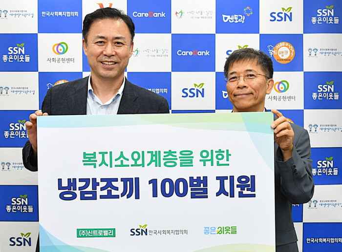 | ▲ 조남권 한국사회복지협의회 사무총장과 최동호 신트로밸리 대표가 전달식 기념 촬영을 하고 있다. |