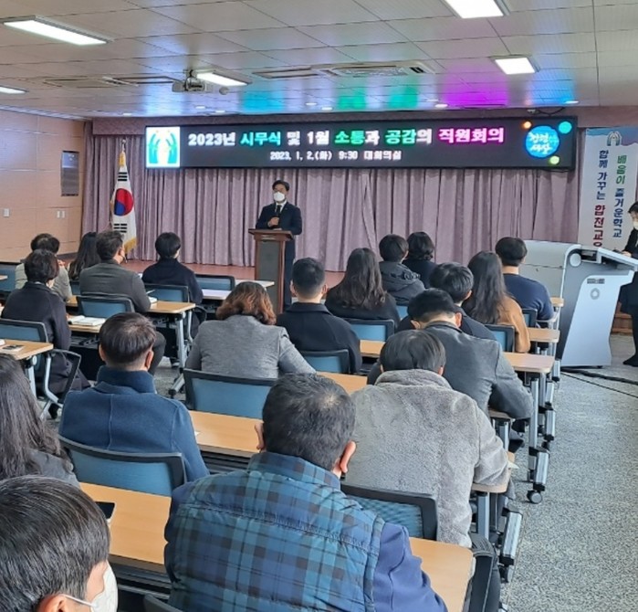 이날 시무식은 2023. 1. 1.자 전입직원을 소개하고 교육장 신년사와 함께 2023년 합천교육 발전을 위해 나아가야 할 방향을 공유하고, 자립과 공존의 힘을 길러주는 교육, 사명감과 보람으로 공직에 임하는 각오를 다지는 시간을 가졌다.