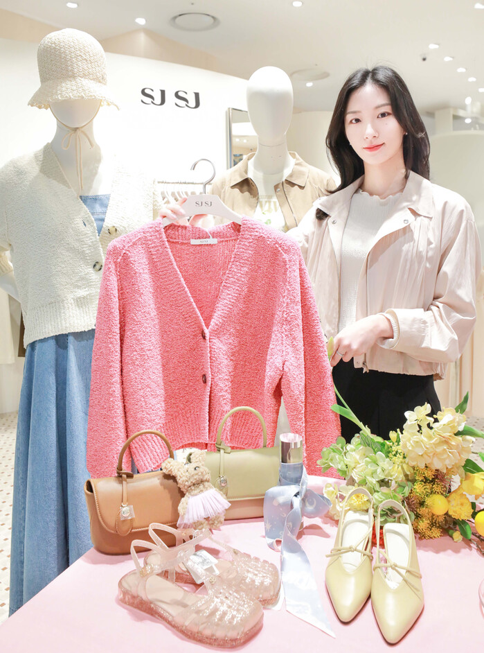 | ▲ 13일 오전, 서울 영등포구에 위치한 더현대 서울 2층 'SJSJ' 매장에서 직원이 화사한 색감이 눈에 띄는 봄·여름 시즌 신상품을 소개하고 있는 모습.(사진=현대백화점 제공) |