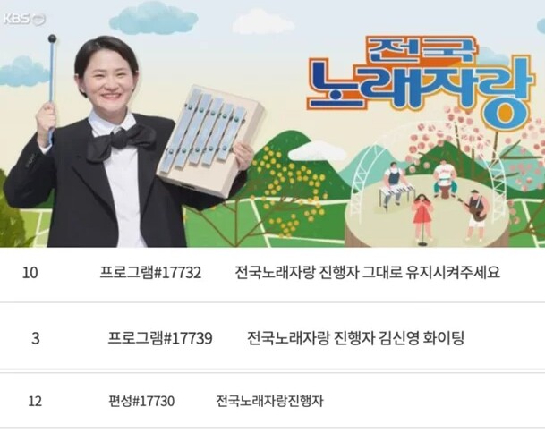 이와 관련해 일부 네티즌들은 KBS 홈페이지 게시판에 김신영 하차 반대 게시물을 잇따라 등재하며 세간의 뜨거운 관심을 대변 중이다.