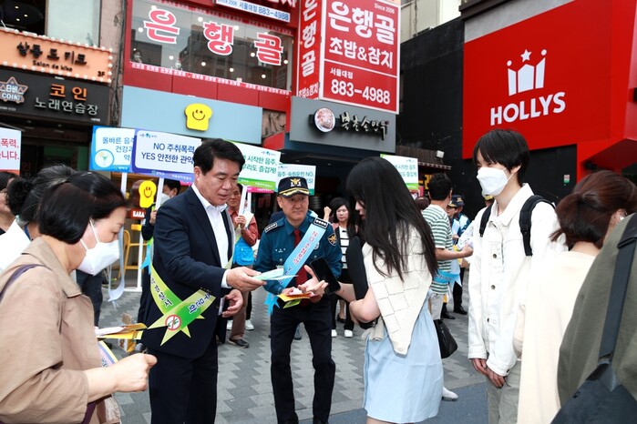 | ▲ 관악구청장과 관악경찰서장이 서울대입구역 인근에서 캠페인을 펼치고 있다.(사진=관악구청 제공) |