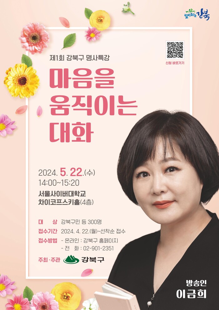 제1회 강북구 명사특강에서는 34년의 방송 생활과 23년간 강의를 해온 방송인 이금희 강사가 '행복한 삶을 위한 대화·소통법'이란 주제로 강단에 선다.