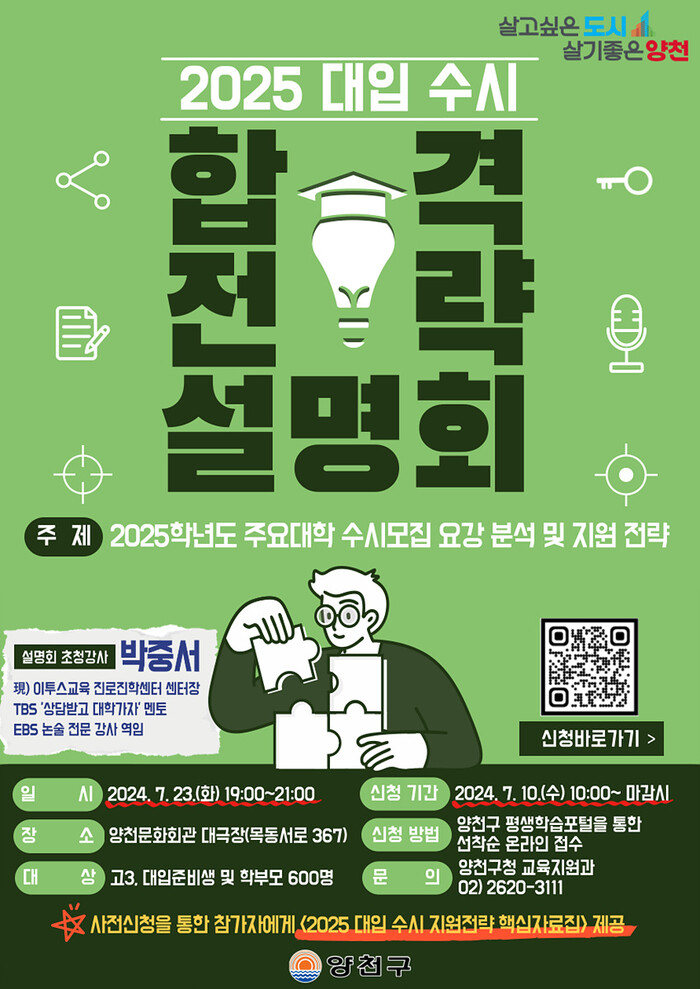 설명회는 오는 23일 오후 7시 양천문화회관 대극장에서 2시간 동안 진행된다. ‘양천구 평생학습포털’에서 선착순으로 접수하고, 온라인 사전신청자에게는 주요 대학의 모집요강이 포함된 ‘2025 수시 전략 자료집’을 제공할 계획이다.