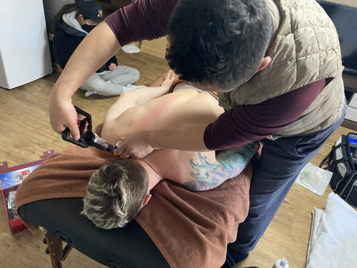 | ▲ 컵핑처치중인 전남스포츠과학연구소 센터장(김태완)과 티모페이 랍신(출처=전라남도체육회) |