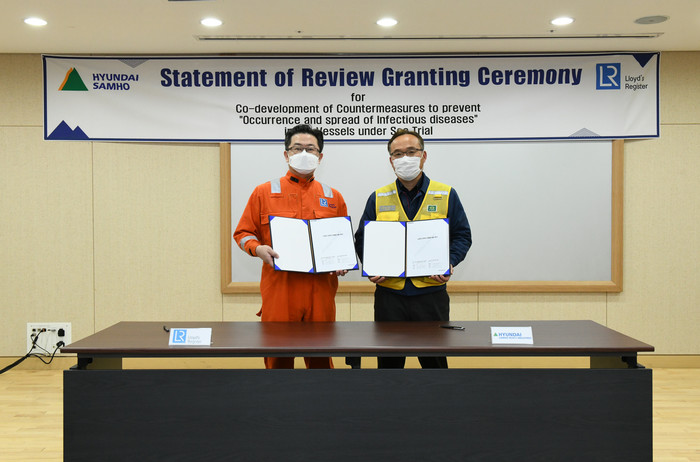 현대삼호중공업은 10일 오후 회사 본관에서 양회수 최고안전책임자와 LR선급의 황선일 동아시아지역 HSE매니저와 안정근 목포 지부장 등 관계자 20여 명이 참석한 가운데 ‘시운전 선박의 감염병 대응 방안에 대한 LR선급 인증 기념식’을 개최했다고 밝혔다.