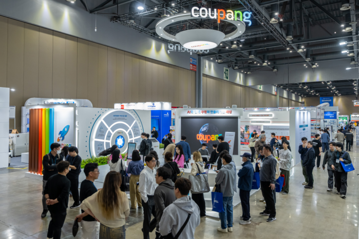 | ▲ 오는 25일까지 일산 킨텍스 제1전시장에서 진행되는 2025 물류산업대전에 참가한 관람객들이 쿠팡 부스를 둘러보고 있다.(사진=쿠팡 제공) |