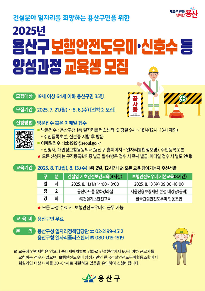 ▲건설업 기초안전보건교육은 8월11일 오후 2시~6시까지 용산아트홀 문화강좌실에서, ▲보행안전도우미 교육은 8월13일 오전 9시부터 오후 6시까지 마포구 신용보증재단 대강당에서 각각 진행된다.