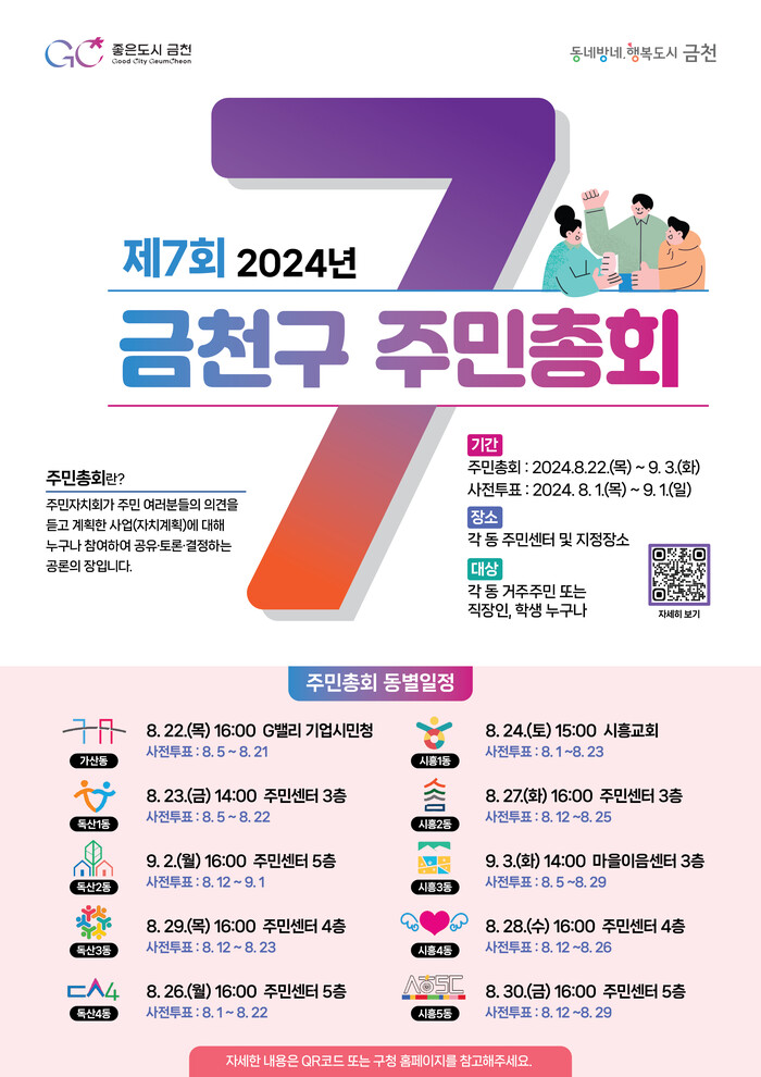 [시민일보 = 여영준 기자] 금천구(구청장 유성훈)는 동별 주민자치회가 오는 22일부터 9월 3일까지 자치 계획을 결정하는 제7회 주민총회를 순차적으로 개최한다고 밝혔다.