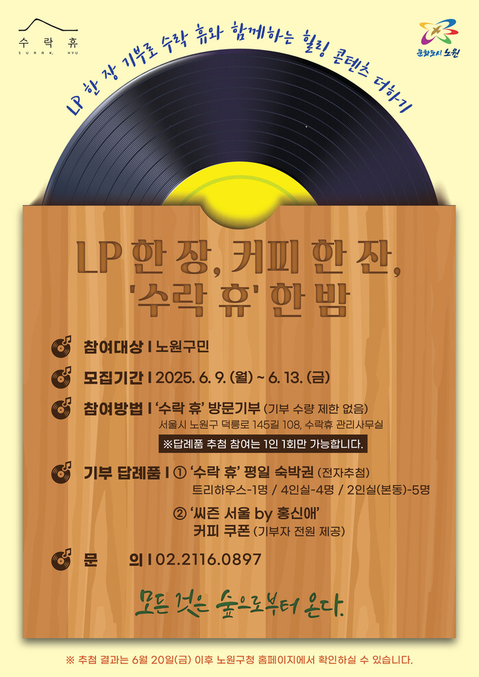 [시민일보 = 박소진 기자] 서울 노원구(구청장 오승록)가 서울 최초의 자연휴양림 수락 휴(休) 개장에 앞서 LP 기부 이벤트를 진행한다고 8일 밝혔다.