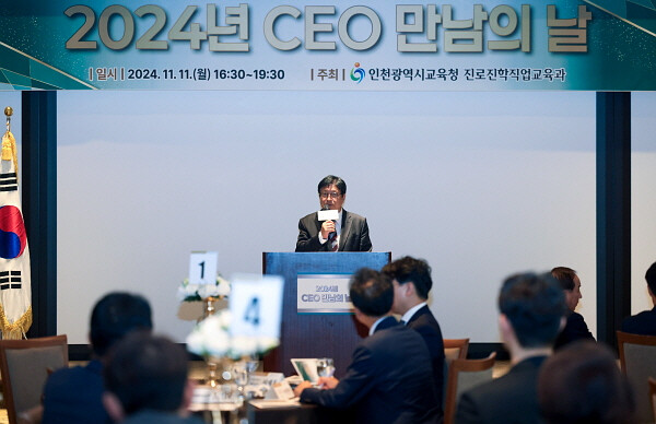| ▲ 11일 도성훈 교육감이 송도 센트럴파크호텔에서 열린 ‘2024 CEO 만남의 날’ 행사에 참석해 인사말을 하고 있다.(사진제공=인천시교육청) |