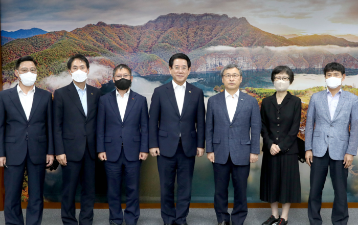 | ▲ 정근식 진실화해위원장, 김영록 전남지사 면담 후 진실화해 일행들과 기념포즈를(출처=진실화해 위원회) |