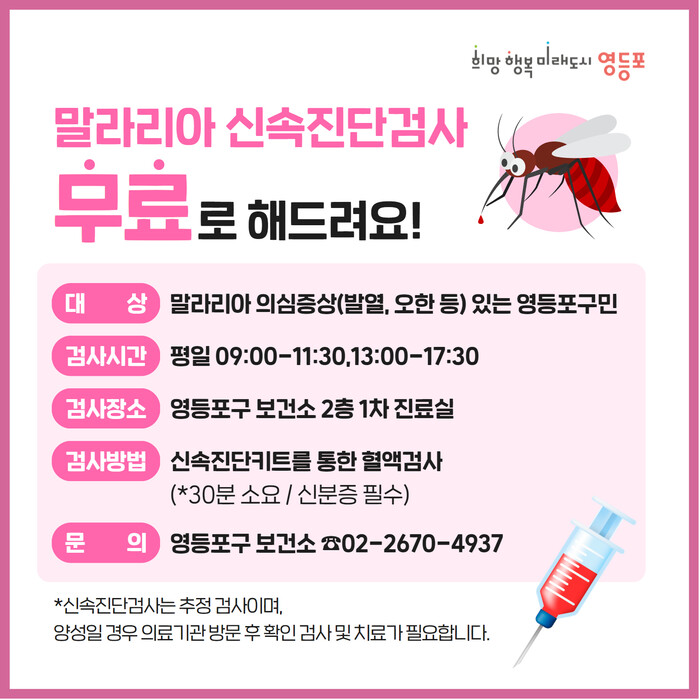 [시민일보 = 여영준 기자] 영등포구(구청장 최호권) 보건소가 말라리아 환자를 조기 발견하고 감염병 확산을 방지하기 위해 1일부터 신속 진단 검사를 무료로 실시한다고 밝혔다.