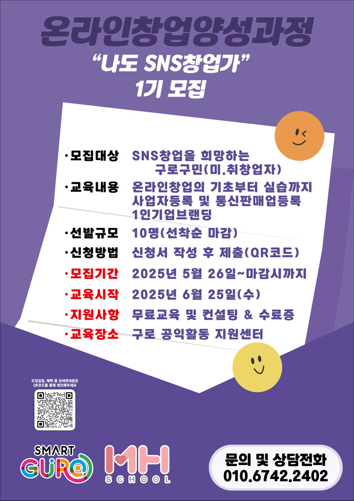 신청은 홍보 포스터의 QR코드를 통해 온라인으로 접수할 수 있으며, 기타 자세한 사항은 구로구청 홈페이지 새소식란에서 확인할 수 있다.