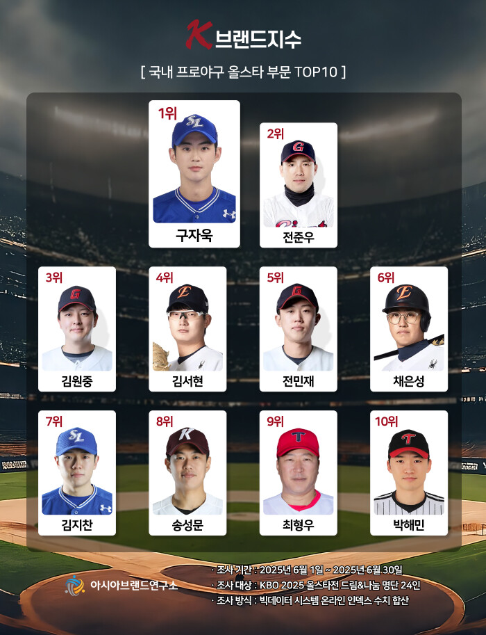 이번 K-브랜드지수 프로야구 올스타 부문은 KBO 2025 올스타전 드림&나눔 명단 24인을 대상으로, 2025년 6월 1일부터 6월 30일까지의 온라인 빅데이터 1597만 5304건을 분석했다.