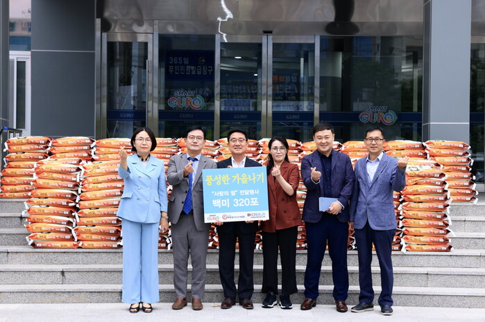 | ▲ 230921 14일 사단법인 희망을 나누는 사람들(회장 김정안)과 사이테크놀로지스㈜(이사 차도일)가 구로구(문헌일 구청장)에 백미 320포를 전달했다. |