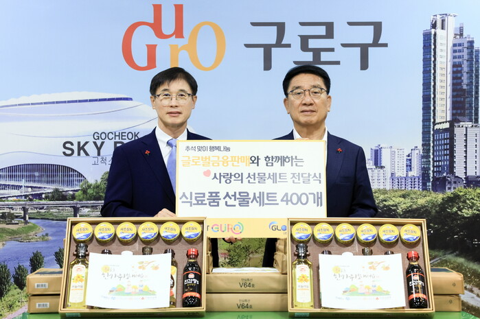 | ▲ 230921 8일 ㈜글로벌금융판매(대표이사 김종선)가 구로구(문헌일 구청장)에 식료품 선물세트 400개를 전달했다. |
