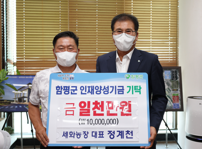 함평군은 22일 “함평 인재양성기금 장학금으로 주거환경개선과 복지사각지대 취약계층을 위해 꾸준한 기부를 이어가고 있는 세화농장 정계천 대표가 1,000만원을, 함평꽃무릇공방 박봉춘 대표가 공방 운영 수입금 100만원을 기탁했다”고 밝혔다.