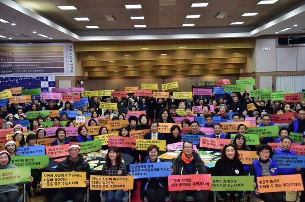 서울 서대문구 천연동·연희동·홍제1동·남가좌1동·북가좌1동 주민자치회 연합 출범식이 지난 13일 오후 서대문구청 대강당에서 열린 가운데 문석진 구청장(가운데)과 자치회 위원들이 행복한 지역 공동체를 염원하는 내용이 담긴 손팻말을 들어 보이고 있다. (사진제공=서대문구청)