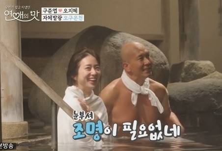 그날 저녁 함께 온천에 들어갔고 오지혜는 구준엽을 바라보며 “오빠 눈부시네요”라고 농담을 던졌다.