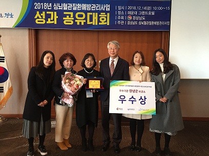 | ▲ ※사진설명: 2018년 심뇌혈관질환 예방관리사업 성과공유대회에서 경상남도지사 표창을 수상하고 기념사진을 찍고 있다. | ||