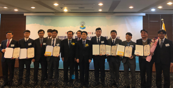 서울 성동구는 최근 한국프레스센터에서 개최된 '제3회 국민생각함 활용 우수사례 공모전' 시상식에서 ‘보행자를 위한 횡단보도 야간 집중조명 설치’로 행정안전부장관상을 수상했다. 사진은 시상식에서 수상자들이 기념촬영을 하는 모습. (사진제공=성동구청)