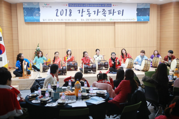 강동구가 지난 15일 구청 5층 대강당에서 ‘2018년 강동구 건강가정·다문화가족지원센터 사업보고회’를 ‘강동가족 파티’ 형식으로 개최했다. 이날 사업보고회는 강동가족센터 10대 뉴스 영상 상영, 우수 직원 및 활동가, 봉사자 등 유공자 표창 수여식 등 다채로운 프로그램으로 꾸며졌다. 사진은 참여자들이 사물놀이 공연을 선보이는 모습. (사진제공=강동구청)