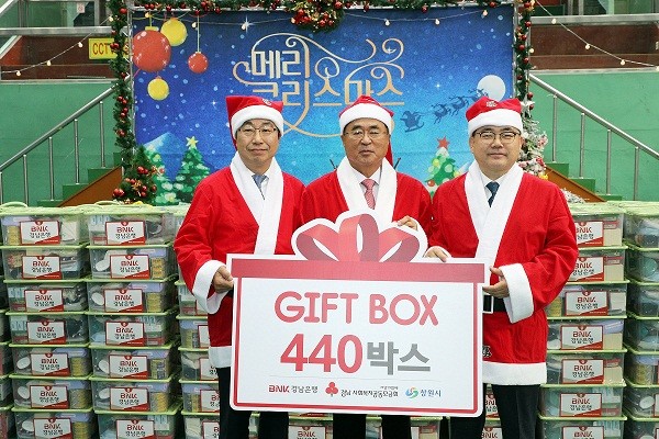 이날 기탁식에는 허성무 창원시장, 황윤철 경남은행장, 한철수 경남사회복지공동모금회장, 자원봉사 400여명이 참여해 기프트 박스를 직접 제작했다. 기프트 박스에는 일상생활에 필요한 장류, 세면용품 등 18여종으로 구성돼 관내 어려운 이웃 440가구에 전달될 예정이다.