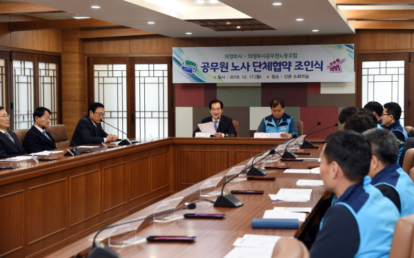 경기 의정부시와 의정부시공무원노동조합은 17일 시청 소회의실에서 의정부시 공무원 노사 단체협약 조인식을 갖고 상호 협력을 다짐했다. 사진은 안병용 시장 및 이규현 위원장 등 참여자들이 이야기를 나누는 모습. (사진제공=의정부시청)