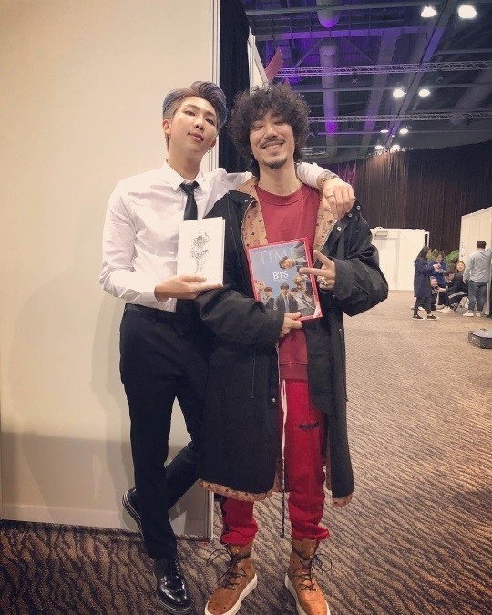 공개된 사진 속 타이거 JK와 RM은 서로의 앨범과 잡지를 들고 인증샷을 촬영 중인 모습. 다정히 어깨동무를 한 채 환히 미소 짓고 있는 두 사람의 모습이 보는 이로 하여금 훈훈함을 자아낸다.