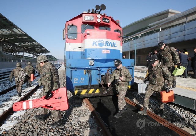 18일 오전 도라산역에서 1사단 장병이 남북 철도공동조사에 나섰던 우리측 열차의 안전점검을 위해 장비를 설치하고 있다.