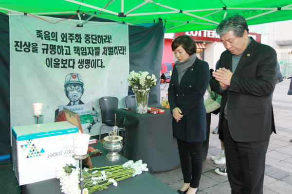 경기도의회 송한준 의장과 안혜영 부의장이 18일 수원역 남측광장에 마련된 고(故) 김용균씨의 분향소를 찾아 조문하고 있다.
