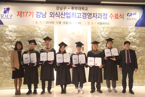 18일 강남구 대치동 라플레이스에서 강남구가 중앙대와 함께 100세 시대 구민 삶의 질 향상을 위해 운영하는 경영 특화 평생학습 프로그램인 제17기 ‘강남외식산업최고경영자과정’ 수료식이 진행됐다. 사진은 정유승 부구청장(오른쪽)이 수료생들과 함께 기념촬영을 하고 있는 모습. (사진제공=강남구청)