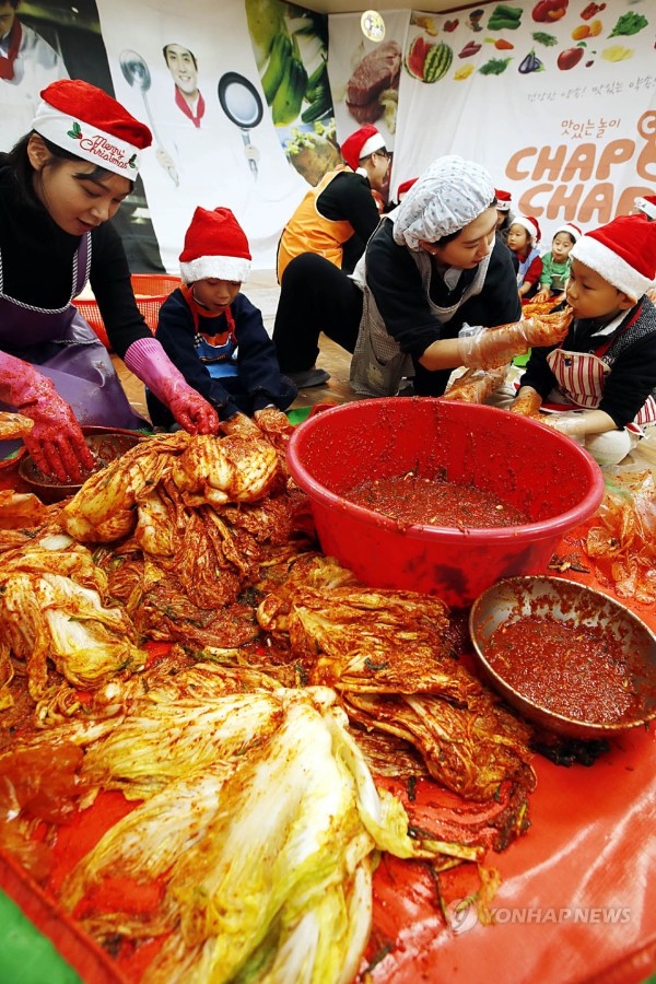 18일 오전 광주 북구 중흥어린이집에서 광주 북구청 신규공무원과 어린이들이 '오늘은 내가 요리사' 체험프로그램을 함께하며 김치를 담그고 있다.
