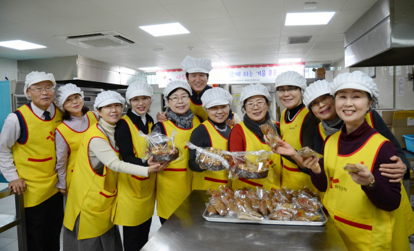 18일 서울시 어린이적십자(RCY) 명예단장협의회와 각 학교의 명예단장(교장) 30명이 대한적십자사 서울시지사 1층 빵나눔터에서 취약계층 아동 및 홀몸노인을 위한 '사랑의 빵'을 만들었다. 사진은 참여자들이 만든 빵을 들고 기념촬영을 하는 모습. (사진제공=대한적십자사 서울시지사)