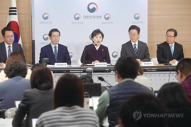 김현미 국토교통부 장관이 19일 서울 종로구 정부서울청사 브리핑룸에서 2차 수도권 주택공급 계획 및 수도권 광역교통망 개선방안을 발표하고 있다. 왼쪽부터 박남춘 인천시장, 박원순 서울시장, 김 장관, 이재명 경기도지사, 조광한 남양주시장.