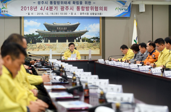 광주시통합방위협의회 의장인 신동헌 시장이 19일 시청 상황실에서 4분기 광주시 통합방위협의회 회의를 개최했다. 이날 회의에서는 내년도 추진 비상대비 시책에 대한 논의가 진행됐다. 사진은 통합방위협의회 회의 진행 모습. (사진제공=광주시청)