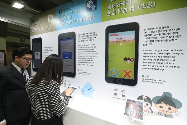 20일 서울 강남구 코엑스에서 콘텐츠, AiㆍIoTㆍVR/ARㆍ빅데이터ㆍ블록체인과 연결되다를 주제로 '앱쇼코리아'가 개최, 관계자가 한국어 모바일 학습 관련 앱을 설명하고 있다.