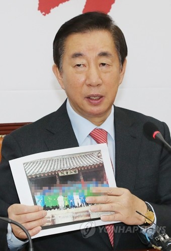 자유한국당 김성태 전 원내대표가 20일 오전 국회 당회의실에서 기자회견을 열고 한겨레신문이 제기한 자신의 딸 kt 특혜채용 의혹에 대해 딸이 사진에 나와 있는 kt신입사원 선비문화 체험수련 기념사진을 들고 근거없는 의혹제기라고 주장하고 있다.