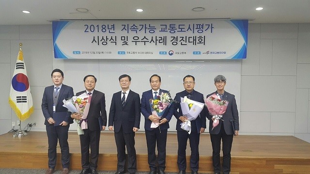 | ▲ <사진설명> 창원시 관계자가 지속가능 교통도시 평가에서 ‘최우수상’을 수상하고 있다. | ||