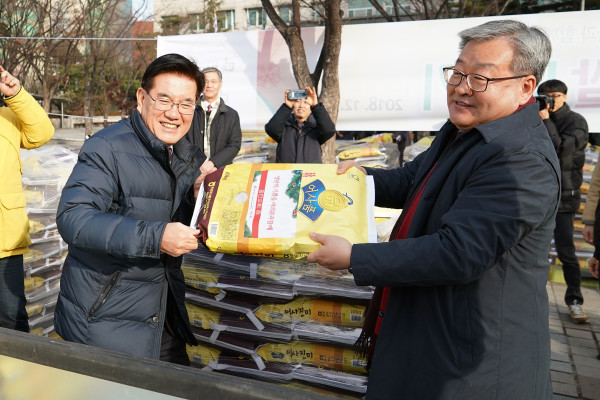 최근 동대문구가 성탄절을 앞두고 동안교회로부터 어려운 이웃을 돕기 위해 마련한 ‘사랑의 쌀’ 2600포(한포당 10kg, 7000만원 상당)를 기탁 받았다. 사진은 ‘사랑의 쌀 전달식’에서 유덕열 구청장(왼쪽)과 김형준 담임목사가 쌀을 나르고 있는 모습. (사진제공=동대문구청)
