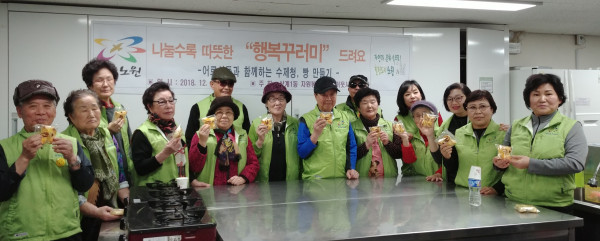 서울 노원구 상계1동 주민센터가 최근 자원봉사캠프와 이웃사랑봉사단 주관으로 수제청 및 빵 만들기 행사를 진행했다. 이날 만들어진 수제청과 빵은 지역내 노인과 저소득계층에 전달됐다. 사진은 행사에 참여한 노인들이 기념촬영을 하는 모습. (사진제공=노원구청)